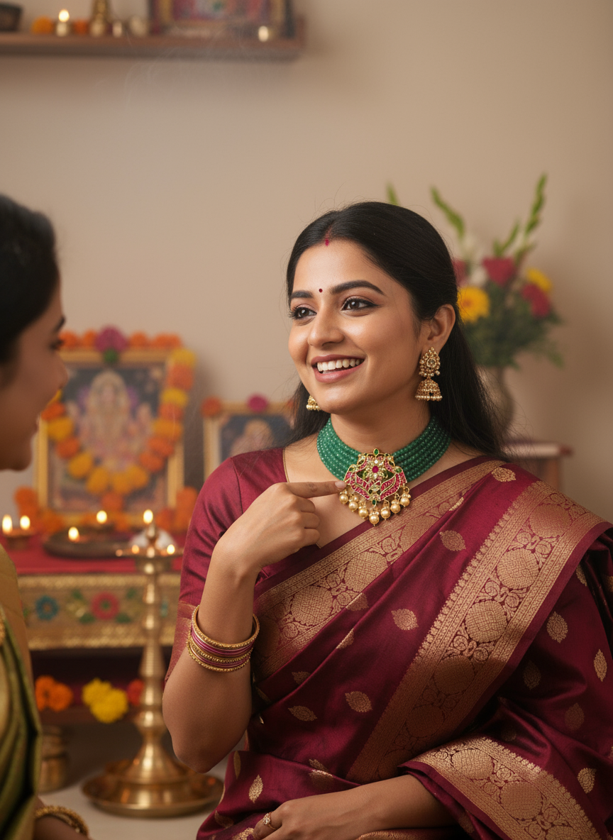 Elevate your style with our Sonali Green Beads Choker featuring a stunning pink kundan pendant in a striking peacock design. Made with high-quality green beads, this choker adds a touch of elegance to any outfit. Make a statement with this unique piece.